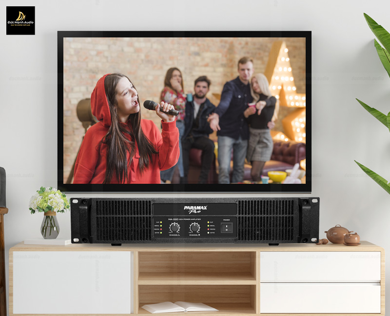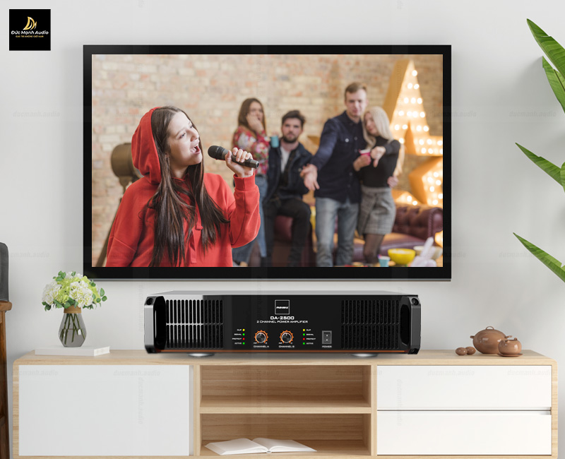 - Amply: Là một trong những thành phần cơ bản và cần thiết của một dàn karaoke gia đình. Đóng vvai trò là thiết bị thu nhận tín hiệu từ thiết bị đầu ra, sau đó xử lý khuếch đại tín hiệu đó và đưa đến cho các thiết bị âm thanh đầu. Được tích hợp cả 2 khả năng là xử lý tín hiệu, căn chỉnh echo hiệu ứng cùng với khả năng khuếch đại với mạch công suất ngay trên cùng một thiết bị.