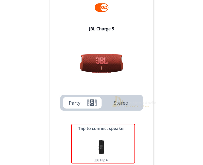 Bước 5: Trên loa JBL Flip 6, tiến hành bật nguồn và bật chế độ bluetooth. Khi đó trên ứng dụng sẽ xuất hiện mục đề xuất kết nối với loa JBL Flip 6 như hình minh họa. Chúng ta nhấn vào biểu tượng loa JBL Flip 6 để tiến hành kết nối 2 loa.