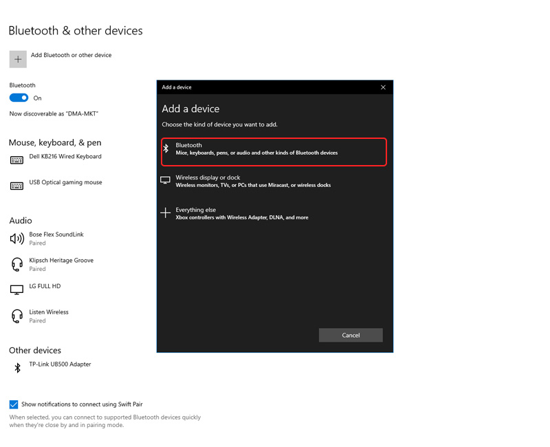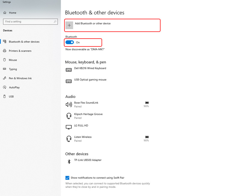 Bước 2: Bật Bluetooth và nhấn vào "Add Bluetooth or other device"