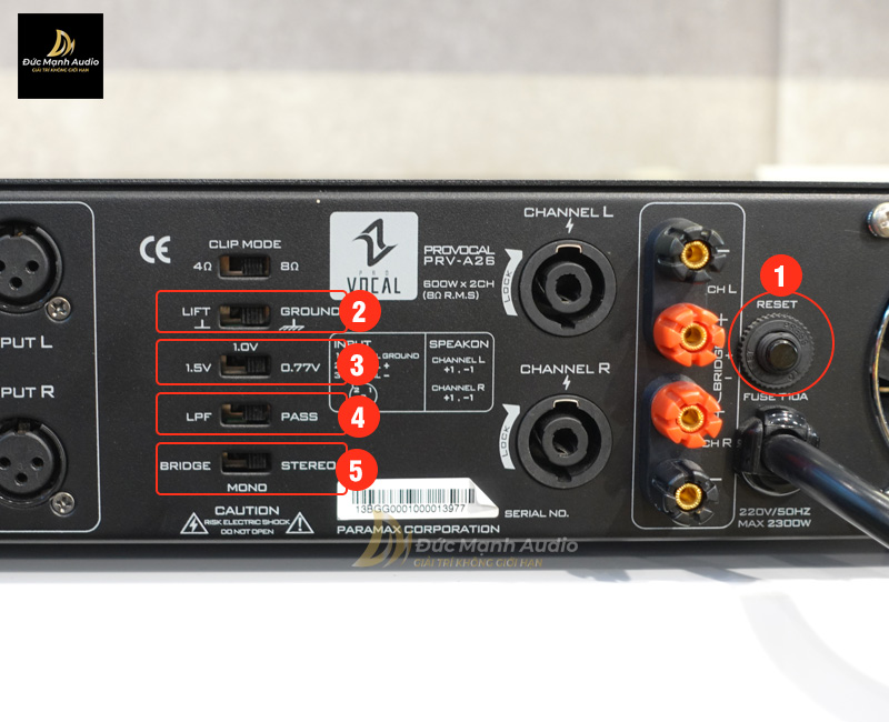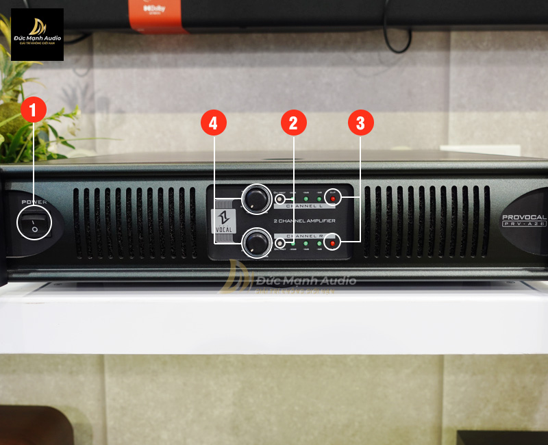 - POWER: Công tắc Tắt/Mở nguồn. Khi bật nút này, mạch bảo vệ thiết bị sẽ hoạt động sau khoảng thời gian từ 1 ~ 2 giây và sẽ kết nối nguồn cho mạch khuếch đại. Trong khoảng từ 3 ~ 4 giây sau đó, mạch bảo vệ sẽ kết nối từ ngõ ra mạch khuếch đại đến với loa.