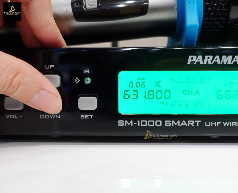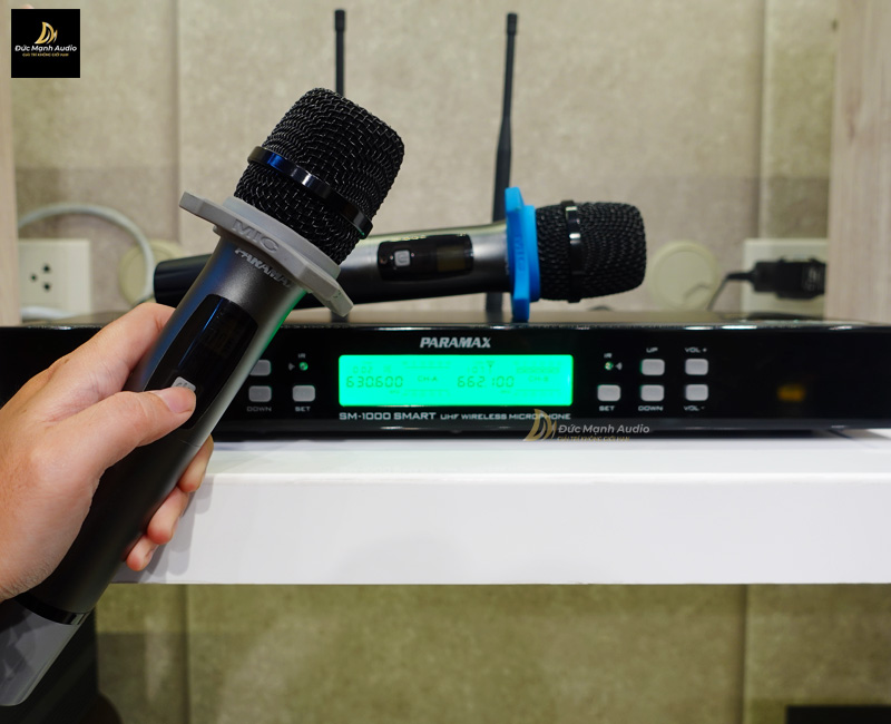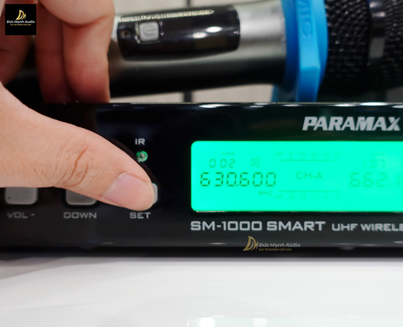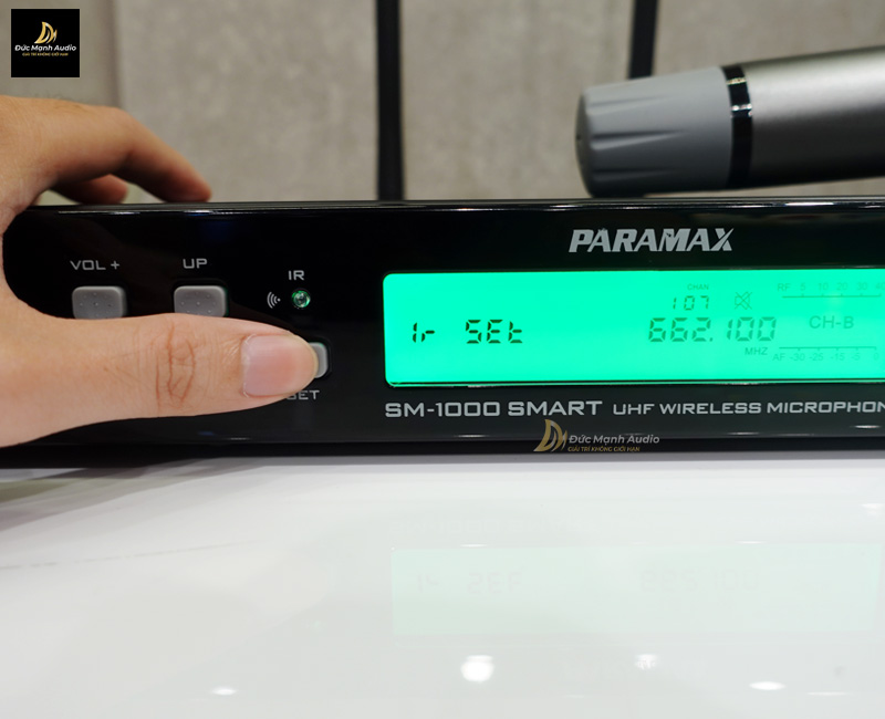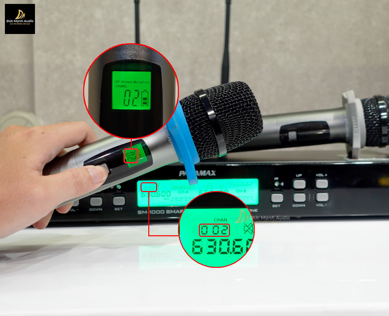 Việc đầu tiên bạn cần phải đó trước khi thay đổi tần số micro không dây đó chính là kiểm tra tần số trên thân micro và bộ đầu thu có cùng 1 tần số hay không (Đức Mạnh Audio thực hiện trên mẫu micro Paramax SM-1000 Smart)