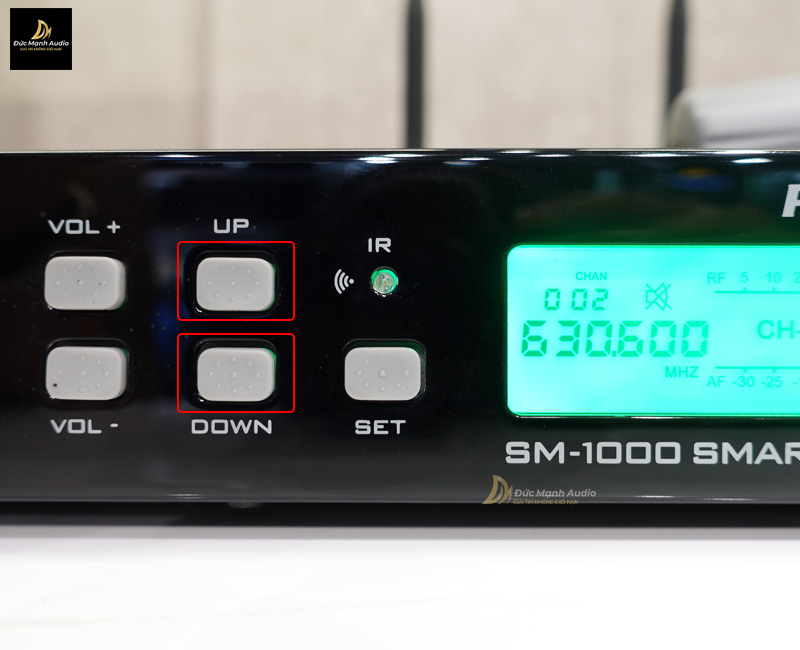 Bạn cần phải xem tần số trên micro, sau đó quan sát trên bộ đầu thu có 2 phím gồm UP hoặc DOWN. Bạn nhấn nút UP (Tăng) hoặc DOWN (giảm) để tiến hành thay đổi tần số cho cùng với tần số trên thân micro.