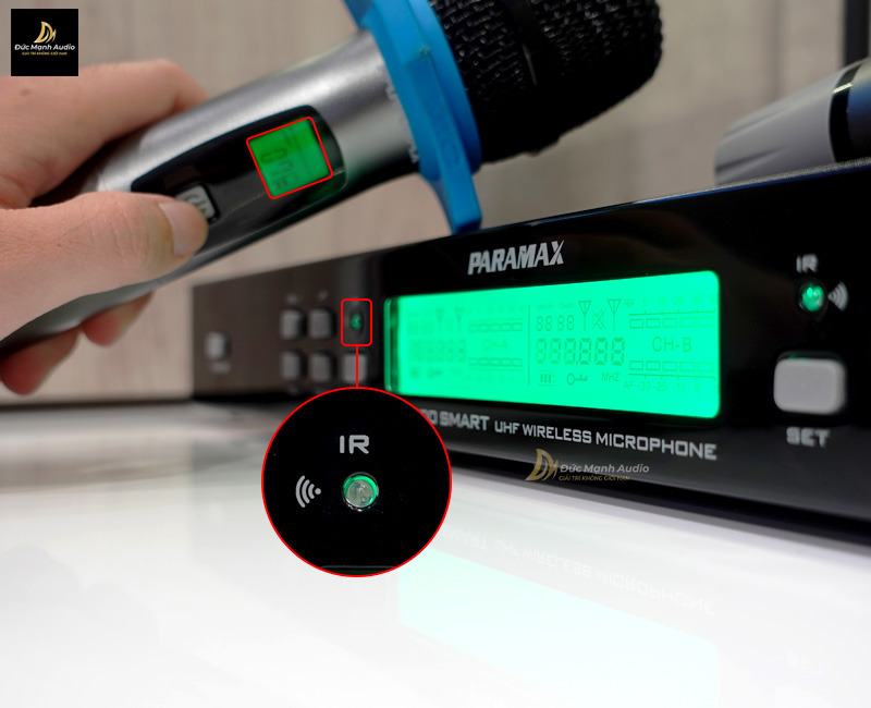 Trên thân micro, ở giữa có màn hình hiển thị LCD, bạn đưa màn hình hiển thị LCD của micro đến trước IR trên bộ đầu thu để tiến hành đồng bộ tần số micro và bộ đầu thu như hình minh họa bên dưới.