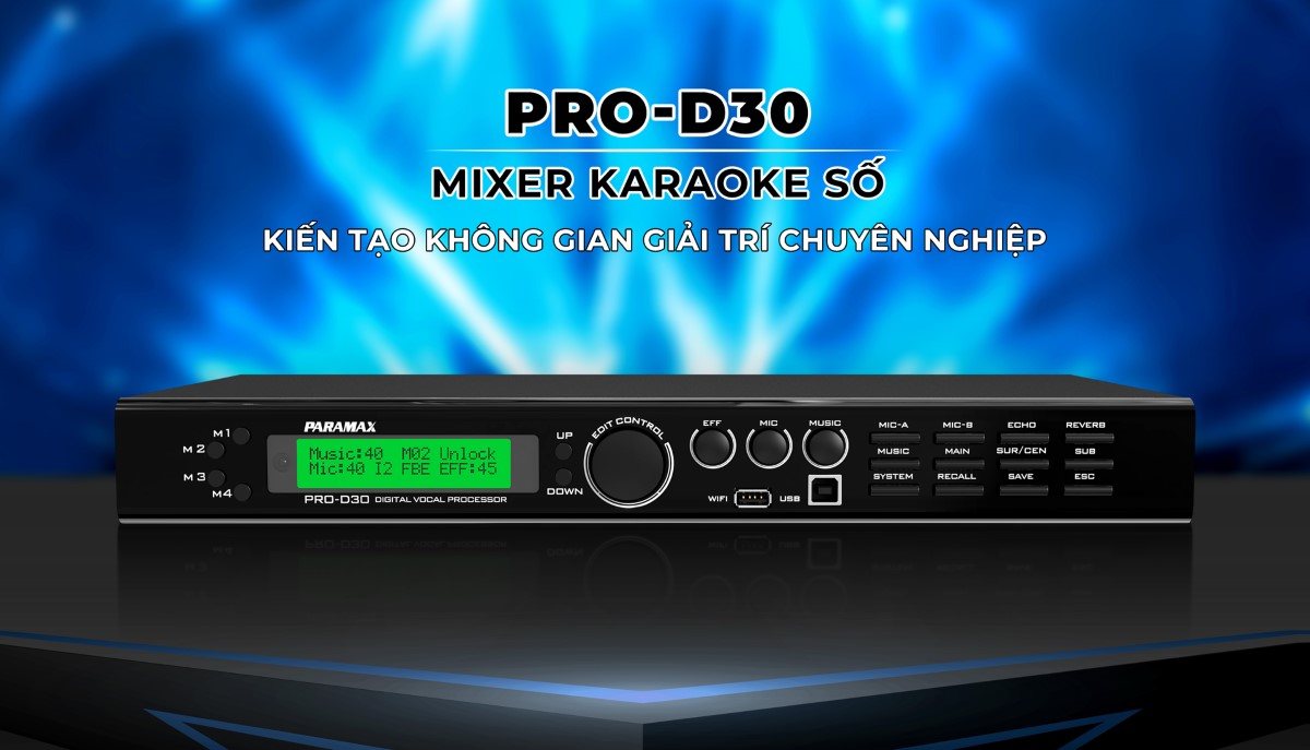 Mixer karaoke Paramax Pro-D30 là mẫu vang số karaoke chuyên nghiệp được trang bị hệ thống linh kiện cao cấp mạnh mẽ bao gồm: CPU dùng chipset của hãng Analog Devices, Chipset D/A và A/D cao cấp của hãng ESS Technology.